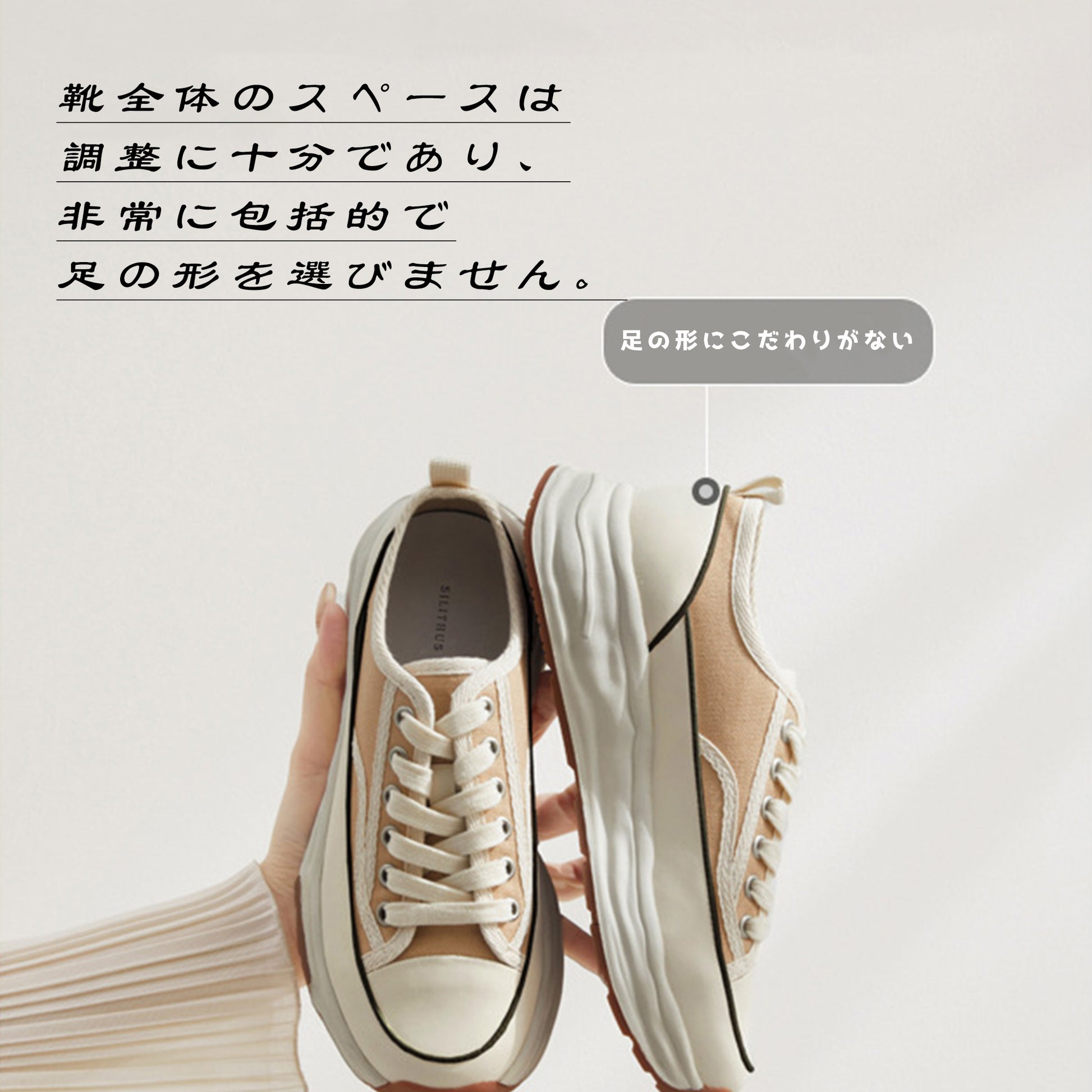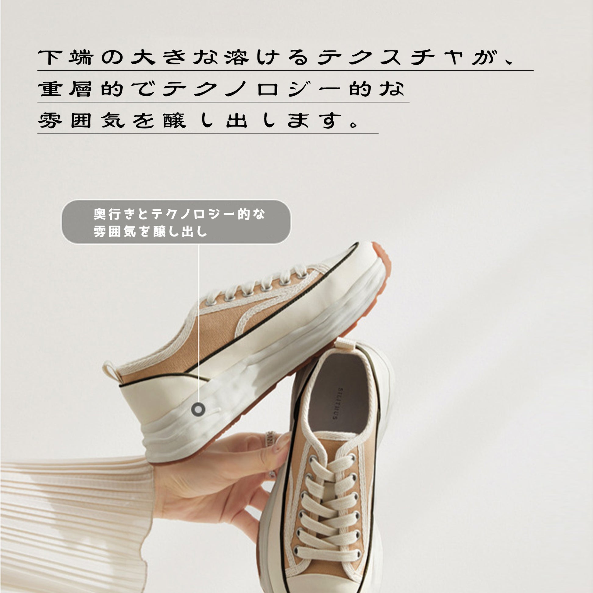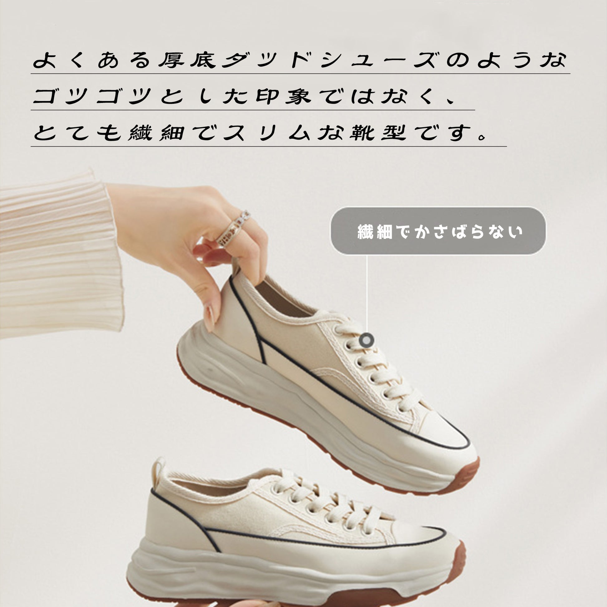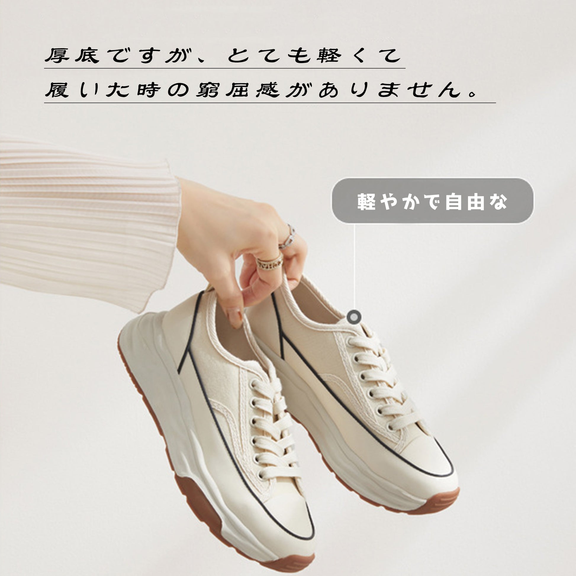 厚底デザインのレースアップキャンバスシューズ。通気性の良いメッシュ素材が快適な履き心地を提供し、フラットソールで安定感も抜群です。シンプルなホワイトカラーはどんなスタイルにも合わせやすく、日常のコーディネートに自然なアクセントを加えます。軽量ながら存在感のある厚底で、美しさと歩きやすさを両立した一足です。