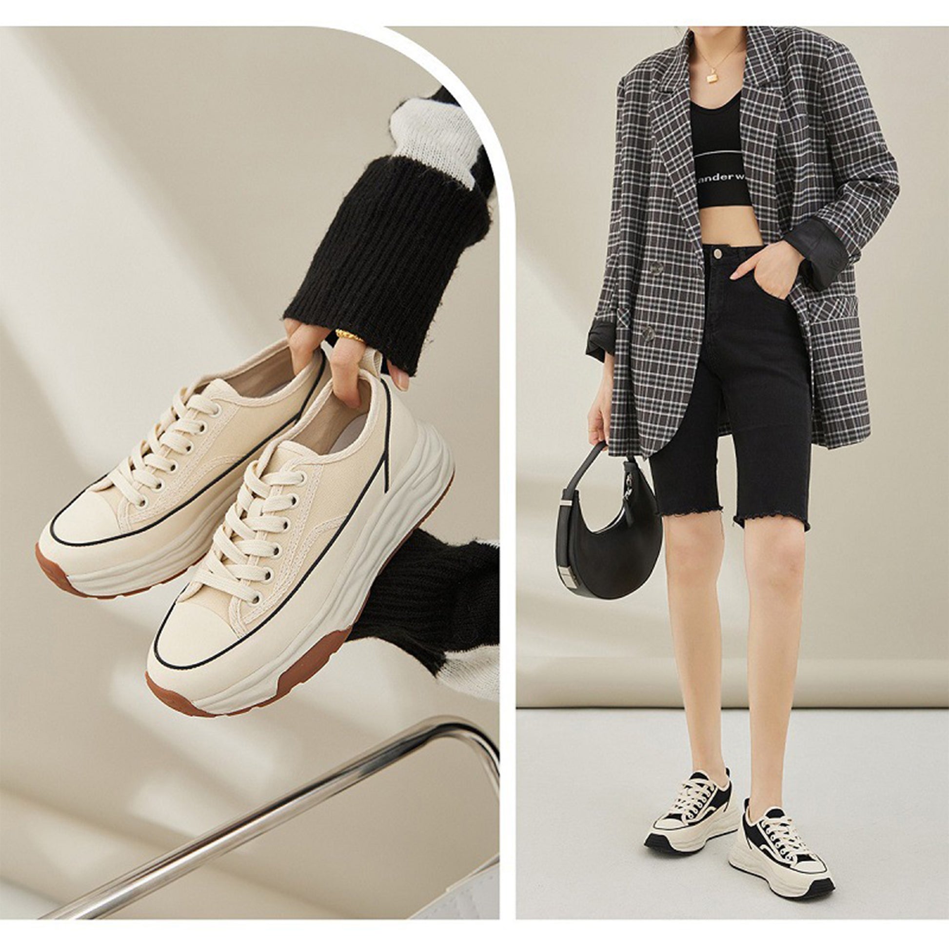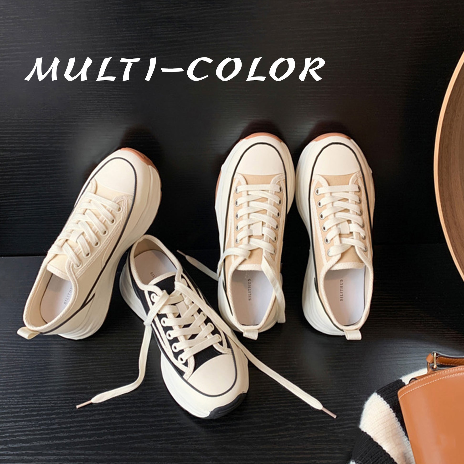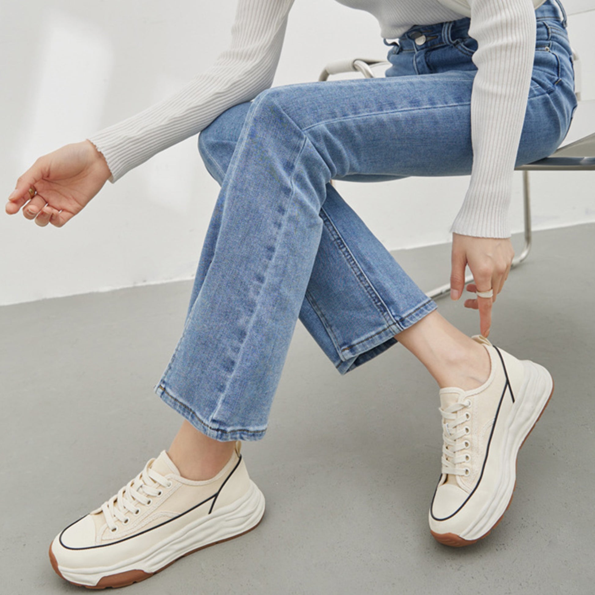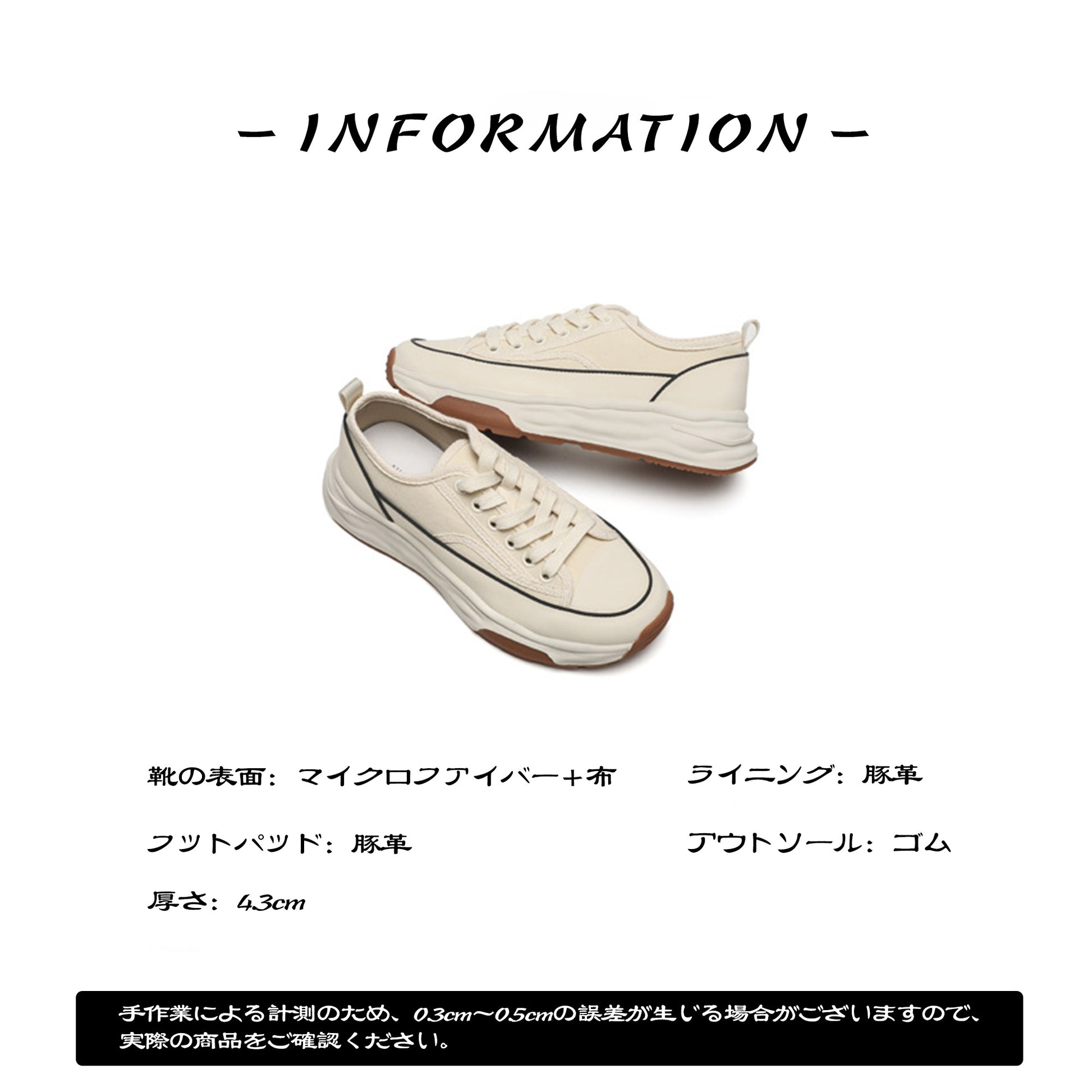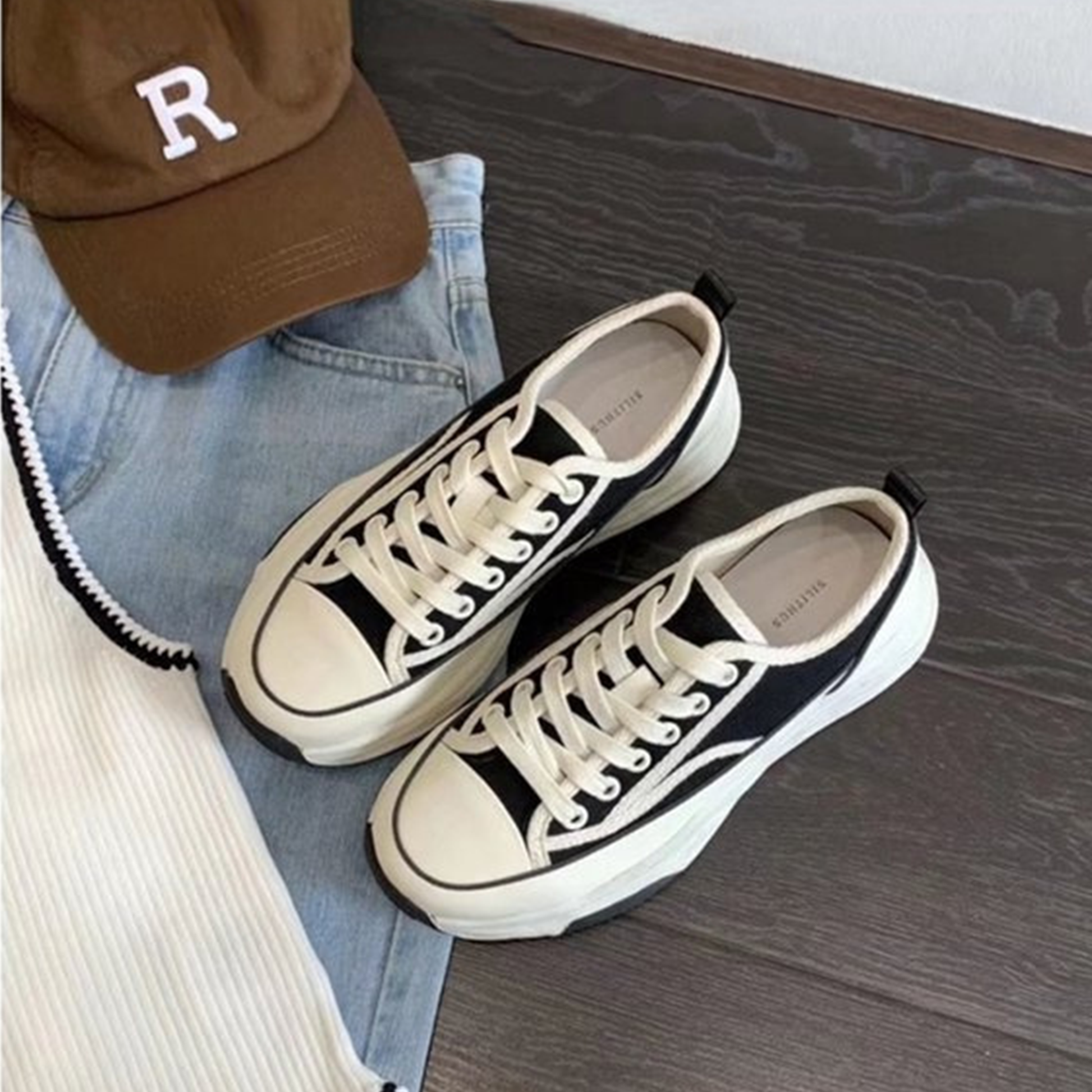 厚底デザインのレースアップキャンバスシューズ。通気性の良いメッシュ素材が快適な履き心地を提供し、フラットソールで安定感も抜群です。シンプルなホワイトカラーはどんなスタイルにも合わせやすく、日常のコーディネートに自然なアクセントを加えます。軽量ながら存在感のある厚底で、美しさと歩きやすさを両立した一足です。